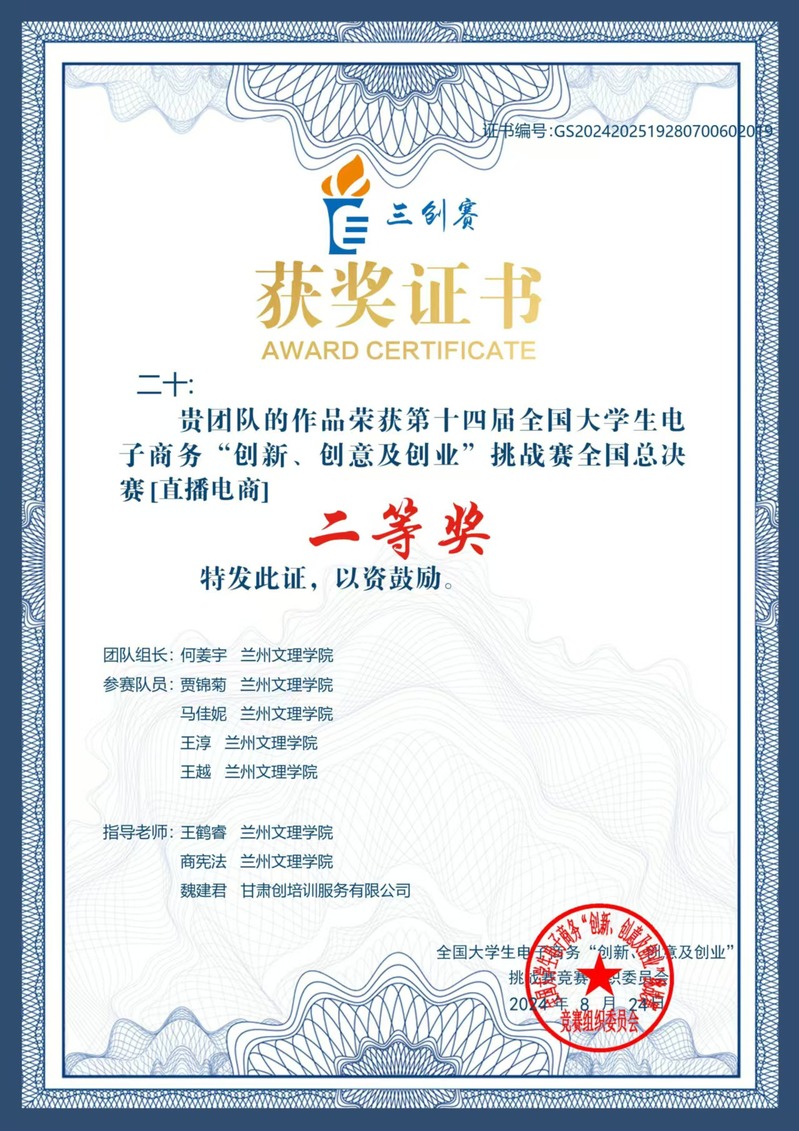 2024年7月25日,由全国大学生电子商务“创新、创意及创业”挑战赛组织委员会和石家庄市鹿泉区人民政府主办、西安交通大学和石家庄理工职业学院承办的“第十四届全国大学生电子商务‘创新、创意及创业’挑战赛直播电商实战赛‘铁宇杯’全国总决赛”在河北石家庄市成功举办。 全国大学生电子商务“创新、创意及创业”挑战赛(简称三创赛)是国内最具影响力和权威性的电子商务类学科竞赛之一。作为国家级A类赛事,三创赛分为常规赛和实战赛两类,其中实战赛分为产学用(BUC)赛道、直播电商赛道、跨境电商赛道、乡村振兴赛道等不同赛道。本次比赛中,全国共有87支队伍入围本届三创赛直播电商实战赛总决赛,其中甘肃省4支队伍获得总决赛参赛资格。 yl6776永利集团的王鹤睿,商宪法老师指导的“二十”团队通过校赛、省赛、国赛的层层角逐,最终获得国赛二等奖的好成绩。 此次获奖不仅彰显了yl6776永利集团学生的创新创业能力,也是对学院坚持以赛促学,以赛促教,强化产教融合教育教学成果的肯定。学院将以此次获奖为契机,进一步深化创新创业教育,提升教育质量,为社会培养更多电商领域的高素质应用型人才。 撰稿:商宪法 撰稿: