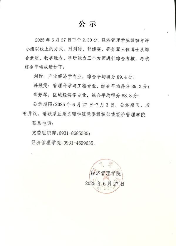 永利官网2025年公开考核招聘博士研究生成绩公示