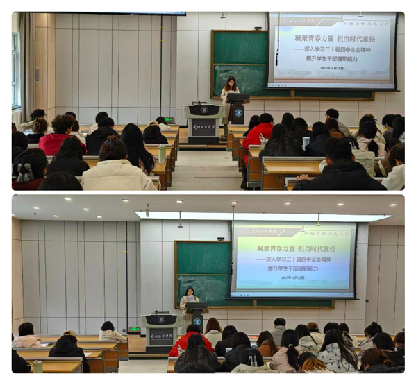 为深入学习贯彻党的二十届四中全会精神,切实提升学生干部综合素养与履职能力,11月21日中午,yl6776永利集团分团委在文昌楼304教室举办以“凝聚青春力量,担当时代重任”为主题的学生干部培训暨二十届四中全会精神宣讲会。学院党总支书记张明荣、全体辅导员、各学生组织骨干及各班班委共同参会。
